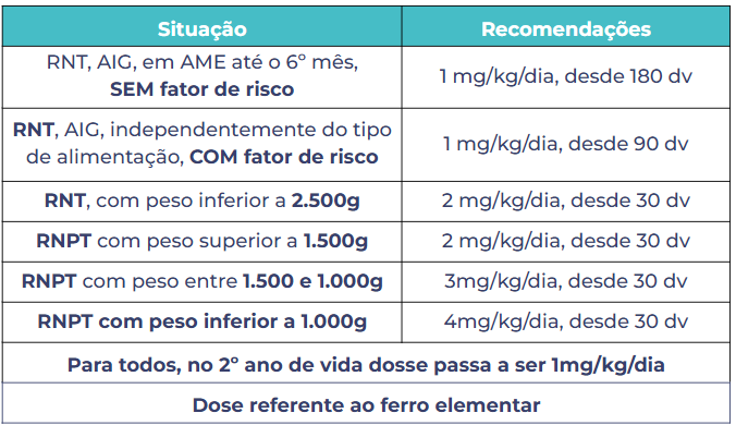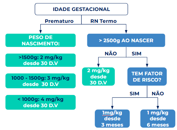Embora o início aos 30 dias de vida esteja correto para um RN a termo com menos 2500g, a dose de 1 mg/kg/dia é insuficiente no primeiro ano de vida. Para este grupo específico, a recomendação é de 2 mg/kg/dia no primeiro ano.