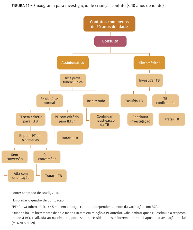 Joana, mãe de 4 filhos, recebeu o diagnóstico de tuberculose pulmonar hå 7 dias (BAAR positivo no escarro espontâneo), só sair da maternidade. Procura a unidade básica de saúde para avaliação dos menores. Todos estão assintomáticos e têm radiografias normais. As idades e os resultados da prova tuberculínica (PT) estao descritos a seguir.