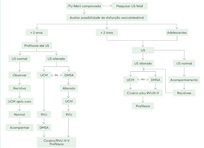 Nem toda criança com ITU precisa sair fazendo todos os exames como USG, cintilografia e uretrocistografia. A investigação por imagem é direcionada, especialmente para os seguintes grupos: