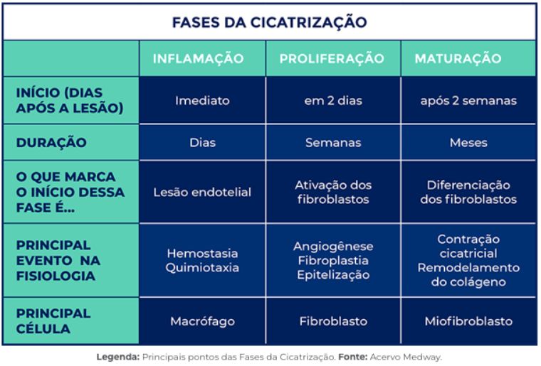 Por fim, a fase de remodelamento pode durar semanas a anos, com reorganização das fibras colágenas, redução da vascularização e aumento da resistência tênsil da cicatriz.