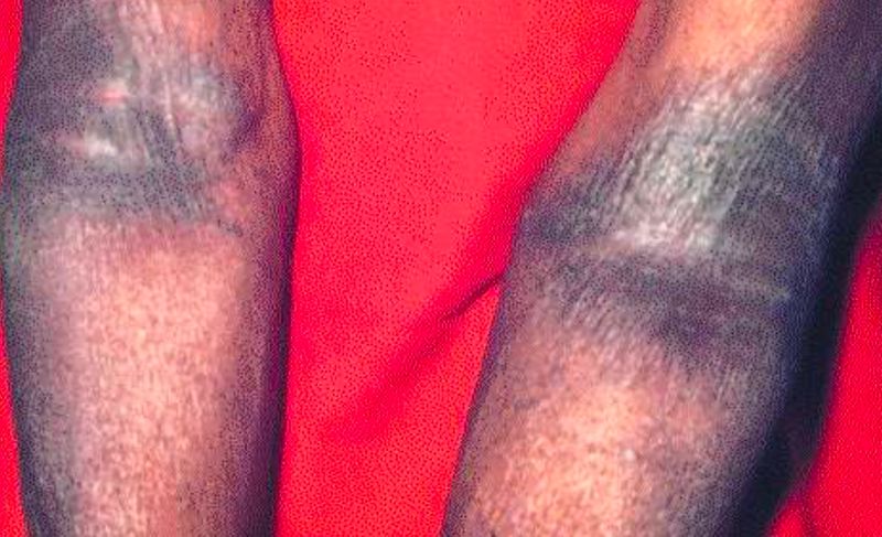 A púrpura, por sua vez, resulta do extravasamento de hemácias na derme e não desaparece à vitropressão. A evolução cromática da púrpura, do vermelho ao verde-amarelado, reflete a degradação progressiva da hemoglobina.