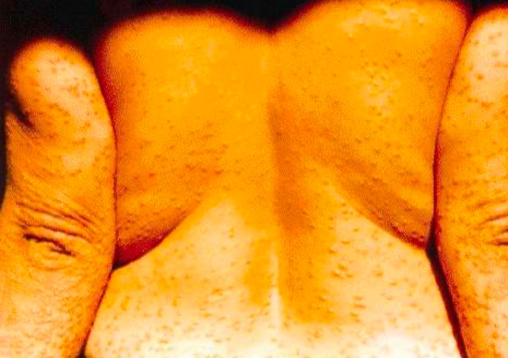 A pápula é lesão sólida, circunscrita, elevada, geralmente menor que 1 cm, podendo ser epidérmica, dérmica ou mista. Quando múltiplas pápulas confluem, formam placa, caracterizada por elevação em platô, frequentemente superior a 2 cm.