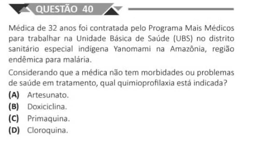 Foi registrado que uma questão do Revalida contraria à diretriz nacional sobre profilaxia da doença, segundo candidatos da edição 2025/2 do exame aplicado pelo Instituto Nacional de Estudos e Pesquisas Educacionais Anísio Teixeira (Inep). O item 40 do Caderno 1 abordou a indicação de quimioprofilaxia para uma médica que atuaria em área endêmica da Amazônia e apontou a doxiciclina como alternativa correta.
