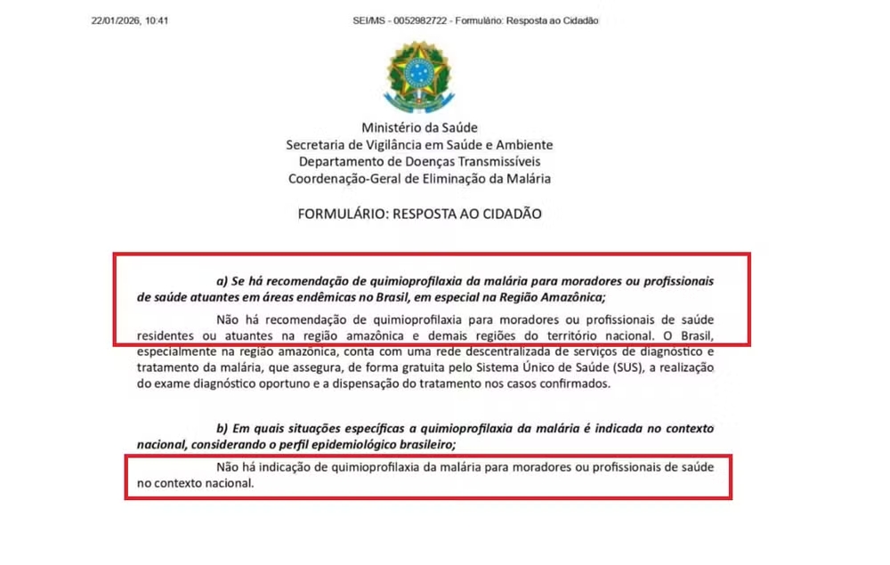 Em resposta formal, à Coordenação-Geral de Eliminação da Malária, vinculada à Secretaria de Vigilância em Saúde e Ambiente, afirmou que “Não há recomendação de quimioprofilaxia para moradores ou profissionais de saúde residentes ou atuantes na região amazônica e demais regiões do território nacional. O Brasil, especialmente na região amazônica, conta com uma rede descentralizada de serviços de diagnóstico e tratamento da malária, que assegura, de forma gratuita pelo Sistema Único de Saúde (SUS), a realização do exame diagnóstico oportuno e a dispensação do tratamento nos casos confirmados.”